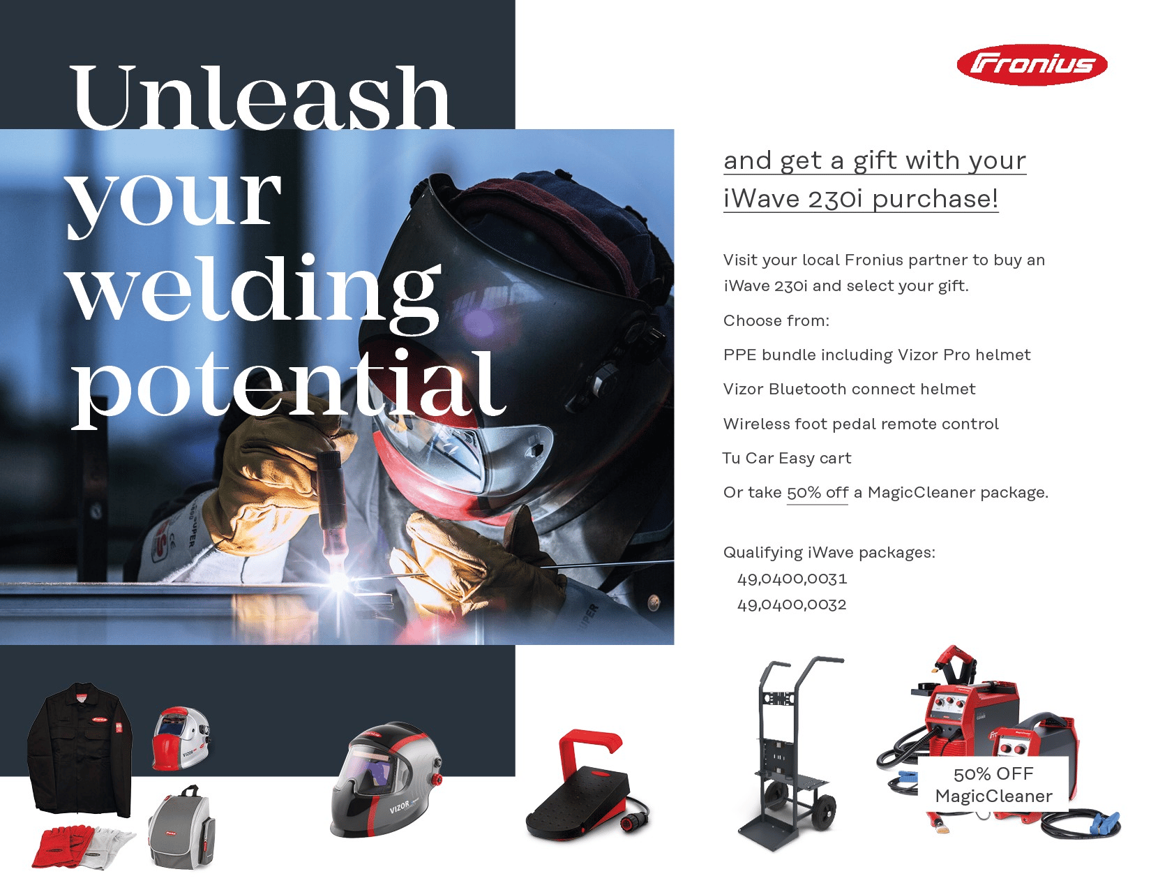 Howdy, This one is for the Welding Crowd. Looking for a great Tig machine? We got you!!! Purchase a Fronius iWave 230i and qualify for the specials bellow. ***Limited quantities, while supplies, One Per Customer*** Look forward to talking soon. Jeff Buster 682.231.0461 jeff.buster@jwbindustries.com jeff.buster@bustersindustrial.com www.bustersindustrial.com